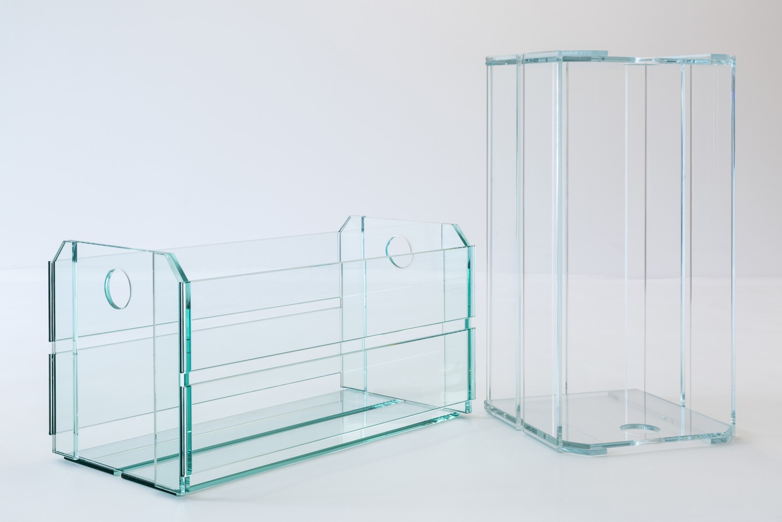 O designer traz, com a versão em vidro da peça, a mesma gama de utilidades, com toda a sofisticação e elegância que as características do material oferecem.