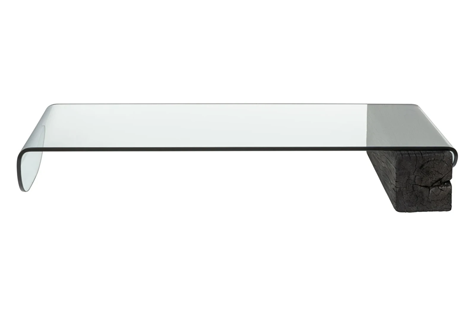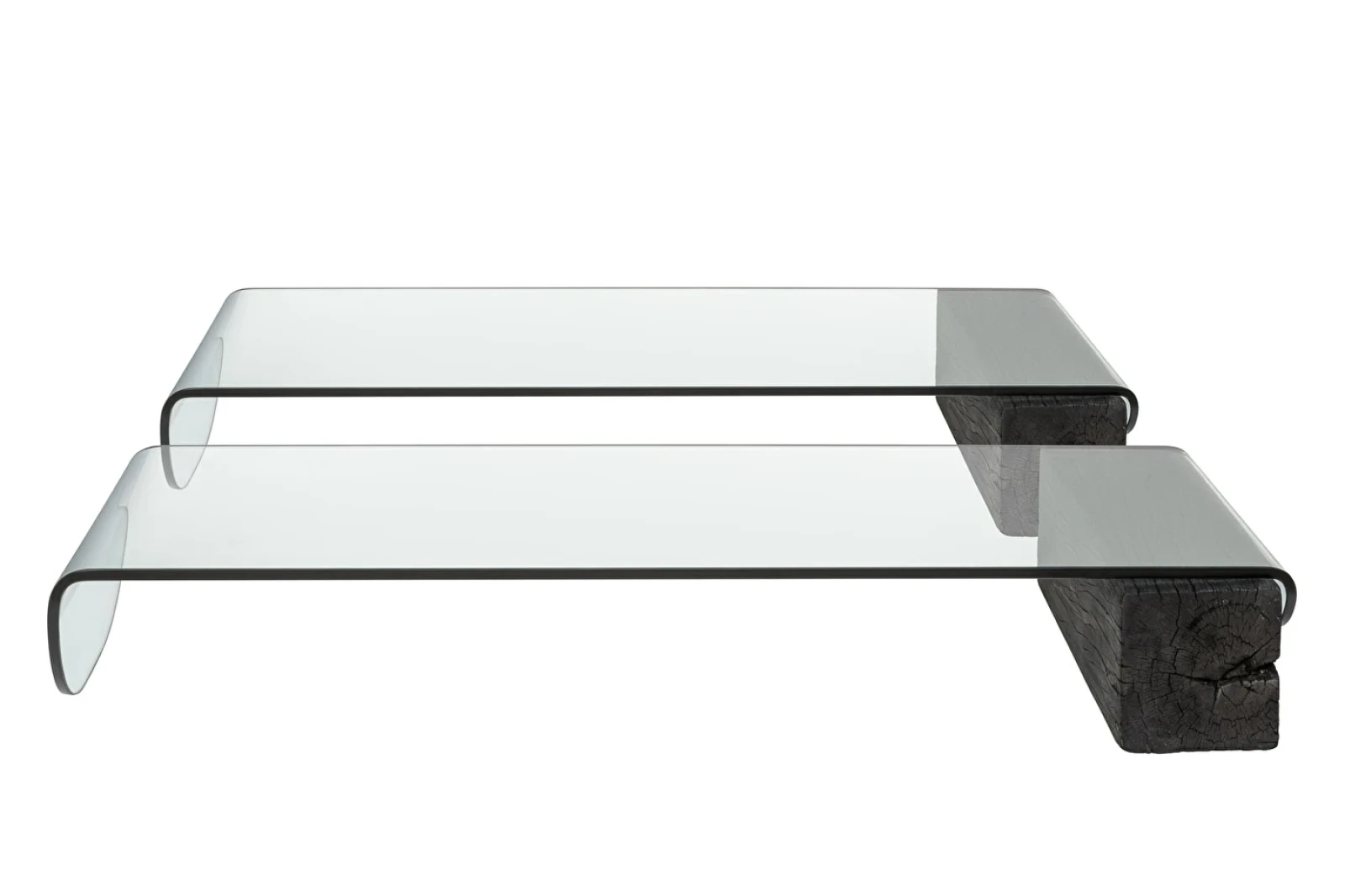 A mesa de centro Primo desafia a rigidez do vidro, criando uma sensação de fluidez que revela formas orgânicas e delicadas.