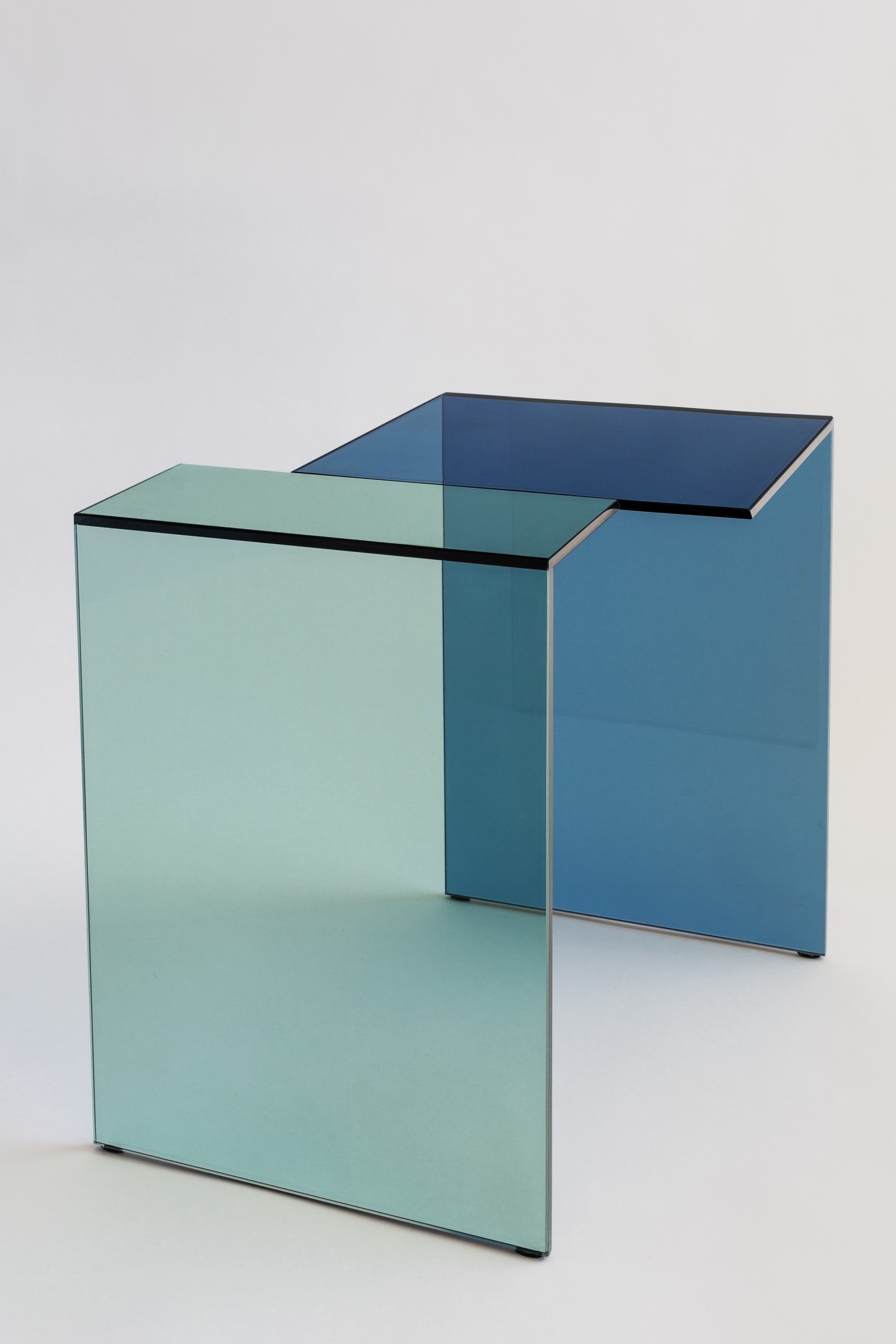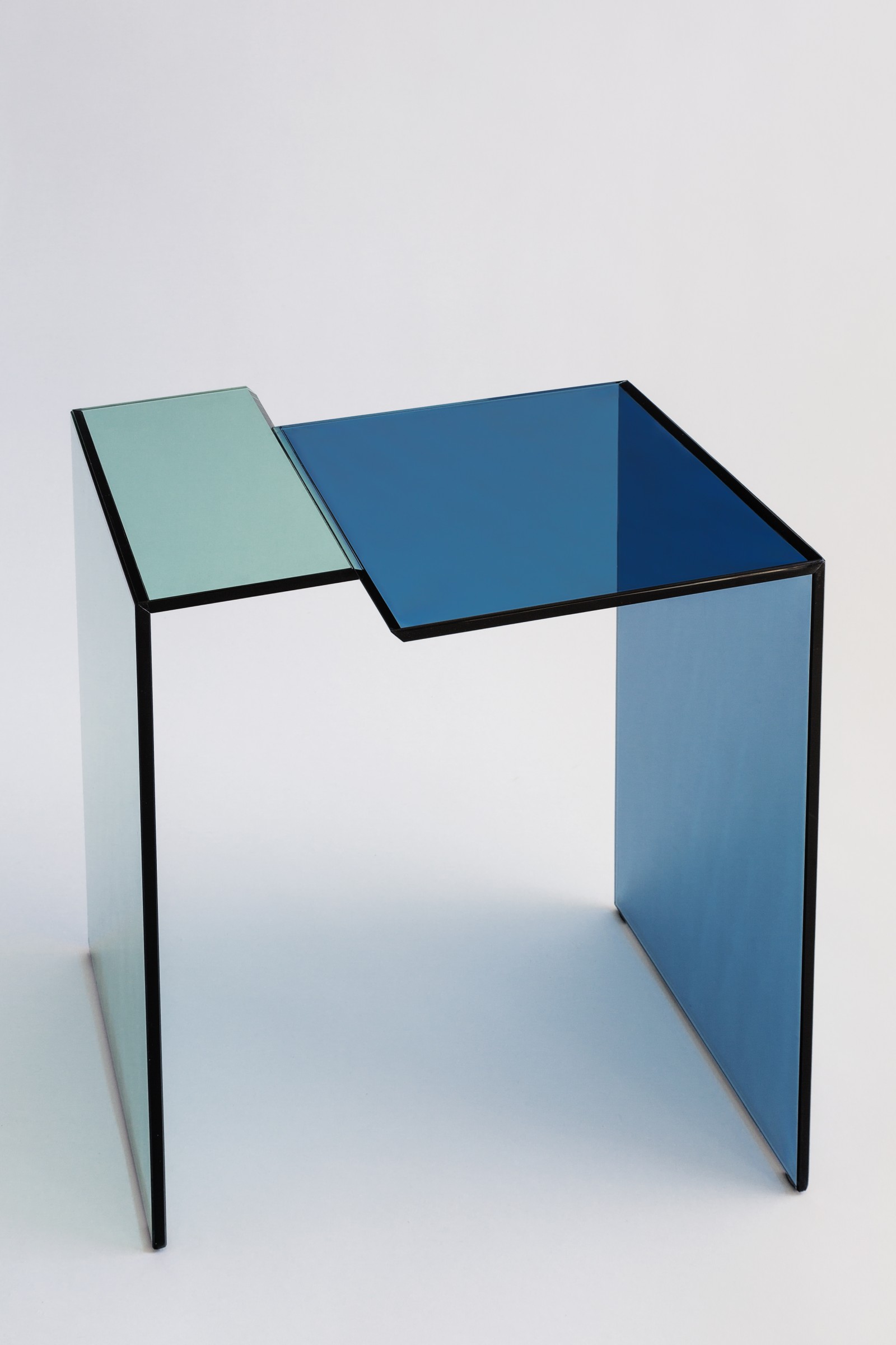 Inspirados pela tradicionalidade dos vidros coloridos, os designers Ricardo Innecco e Mariana Ramos - do Estúdio RAIN - lançam uma coleção completa de mesas de apoio, que exploram a combinação das cores clássicas de vidro. As mesas são formadas por partes assimétricas que se desalinham em um corte prismático, revelando o conceito principal do projeto: a mistura dos tons. A coleção é composta por três peças de diferentes proporções e construídas totalmente em vidro.